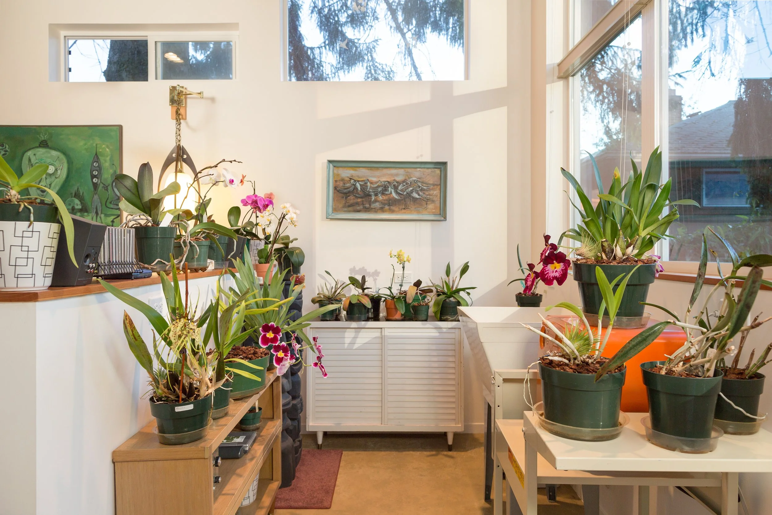 This backyard oasis was designed and built in 2008, pre-dating the tiny house movement that soon followed. The owners desired a place to cultivate their creativity, care for their plants, and shelter occasional guests. Natural light is plentiful, allowing for the best possible light to study, sketch, and paint by. The owner’s orchid collection thrives in the cooler temps made possible by the shelter’s separation from the house.